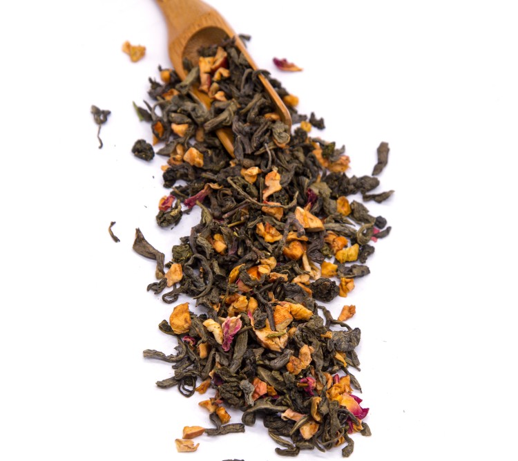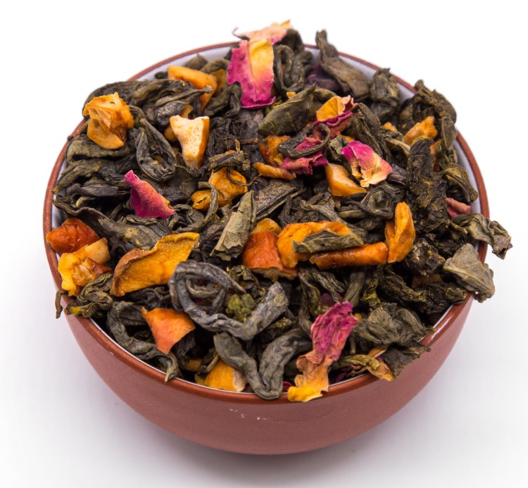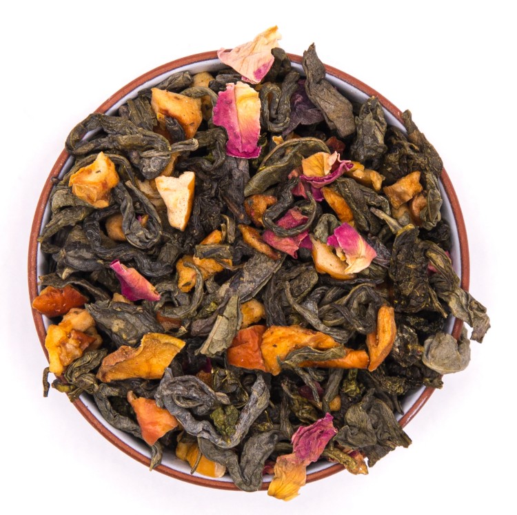 китайский среднелистовой зеленый чай, бирюзовый чай Те Гуань Инь, яблоко, розовые лепестки и пищевой ароматизатор.